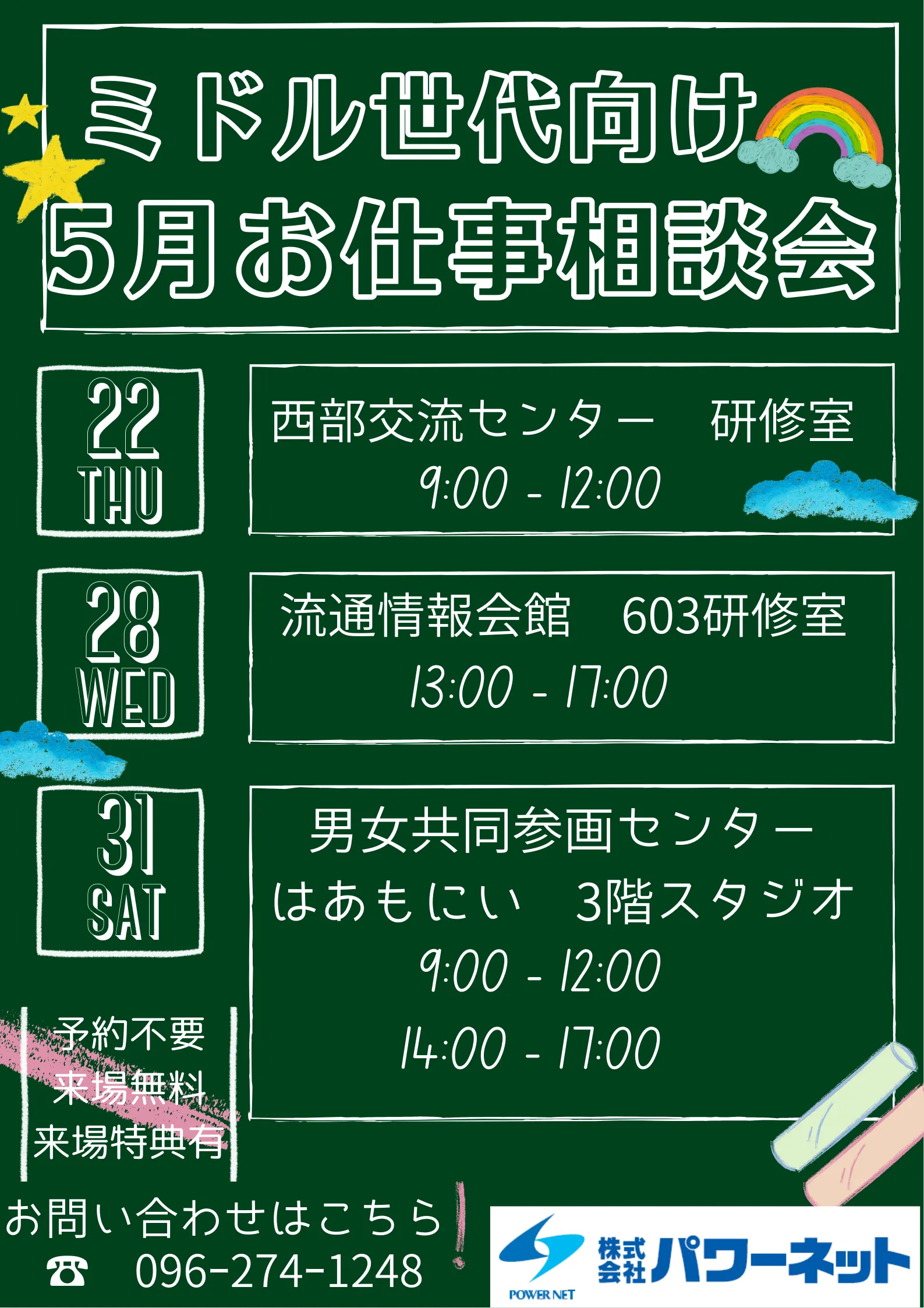 新年度の雰囲気も落ち着いた今、転職をお考えの方、年度変わりで引き続きお仕事をお探しの方向けの相談会を行います!