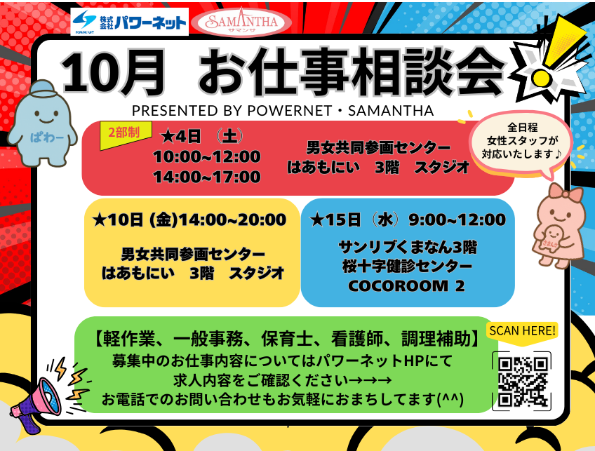 10月から毎月5回熊本市内様々な場所で開催していきますので、ご都合の良い日時にお仕事を探されている方はぜひお越しください(^^)/